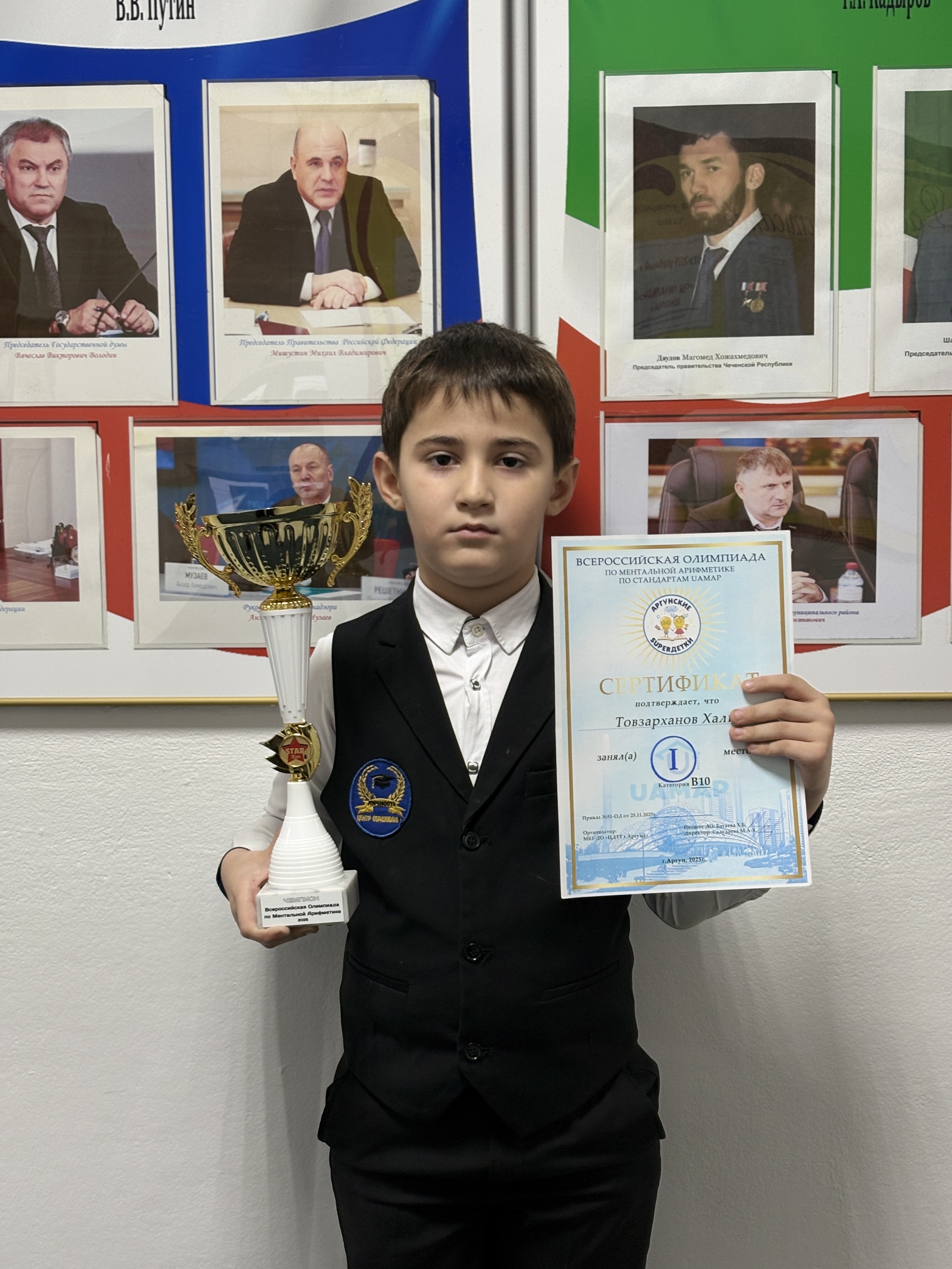 Ученик 2 «А» класса Товзарханов Халид принял участие во Всероссийской Олимпиаде по ментальной арифметике и по трем категориям занял первые места